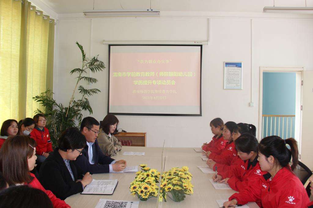 随着党史学习教育深入开展,为把“我为群众办实事”落细落实,4月22日下午,3044永利集团开展渭南市学前教育教师学历提升专项动员会第二场,来到师院朝阳幼儿园。3044永利集团副经理刘永勤、办公室主任牛渭敏,朝阳幼儿园园长谢荣及有学历提升需求的教师代表等20余人参加动员会。